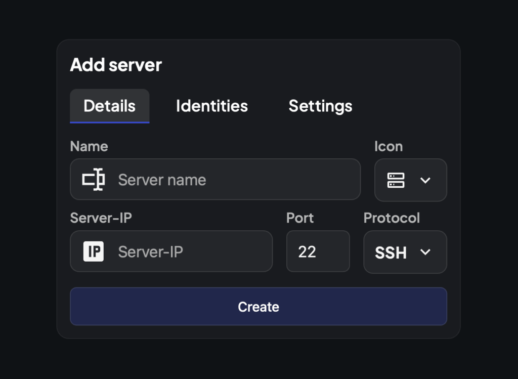 Unter Identities kannst du deinen Usernamen und das Passwort hinterlegen. So bist du mit nur einem Klick direkt mit deinem Server verbunden.