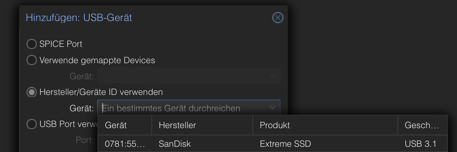 Was wir machen müssen, ist den USB-Stick hinzufügen. Also einmal auf Hinzufügen → USB-Geräte und dort über Hersteller-/Geräte-ID das richtige Gerät auswählen.