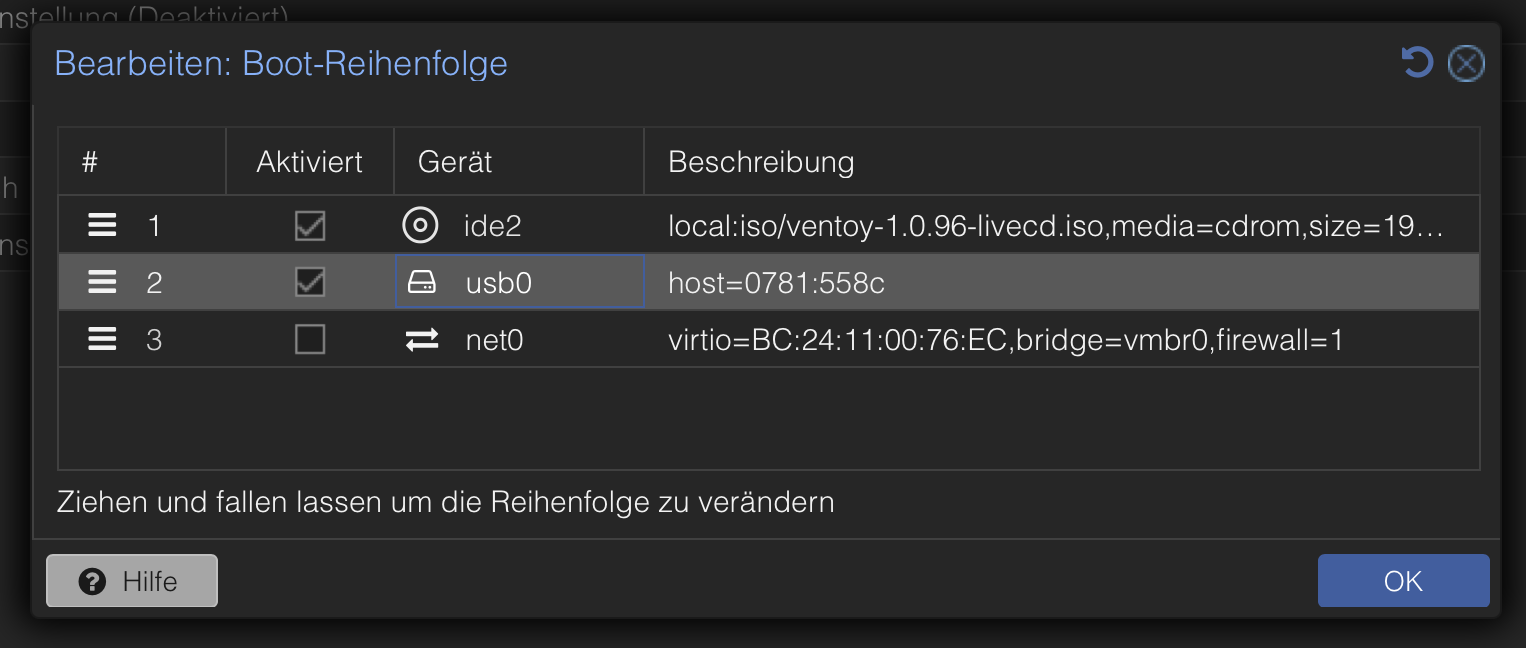 Unter Optionen muss ggf. die Boot-Reihenfolge angepasst werden, und zwar so, dass Ventoy (CD-ROM) oben steht.
